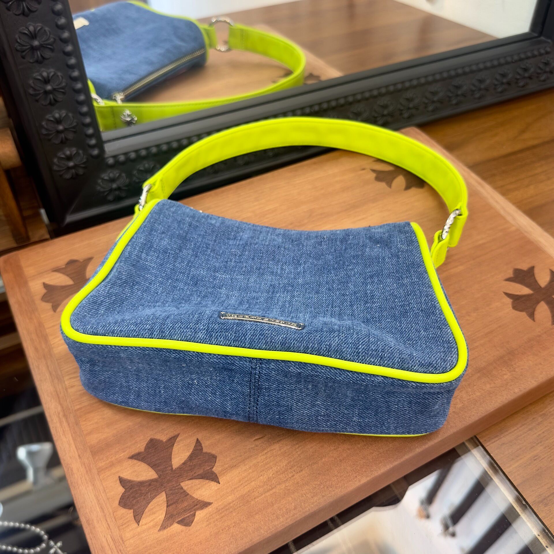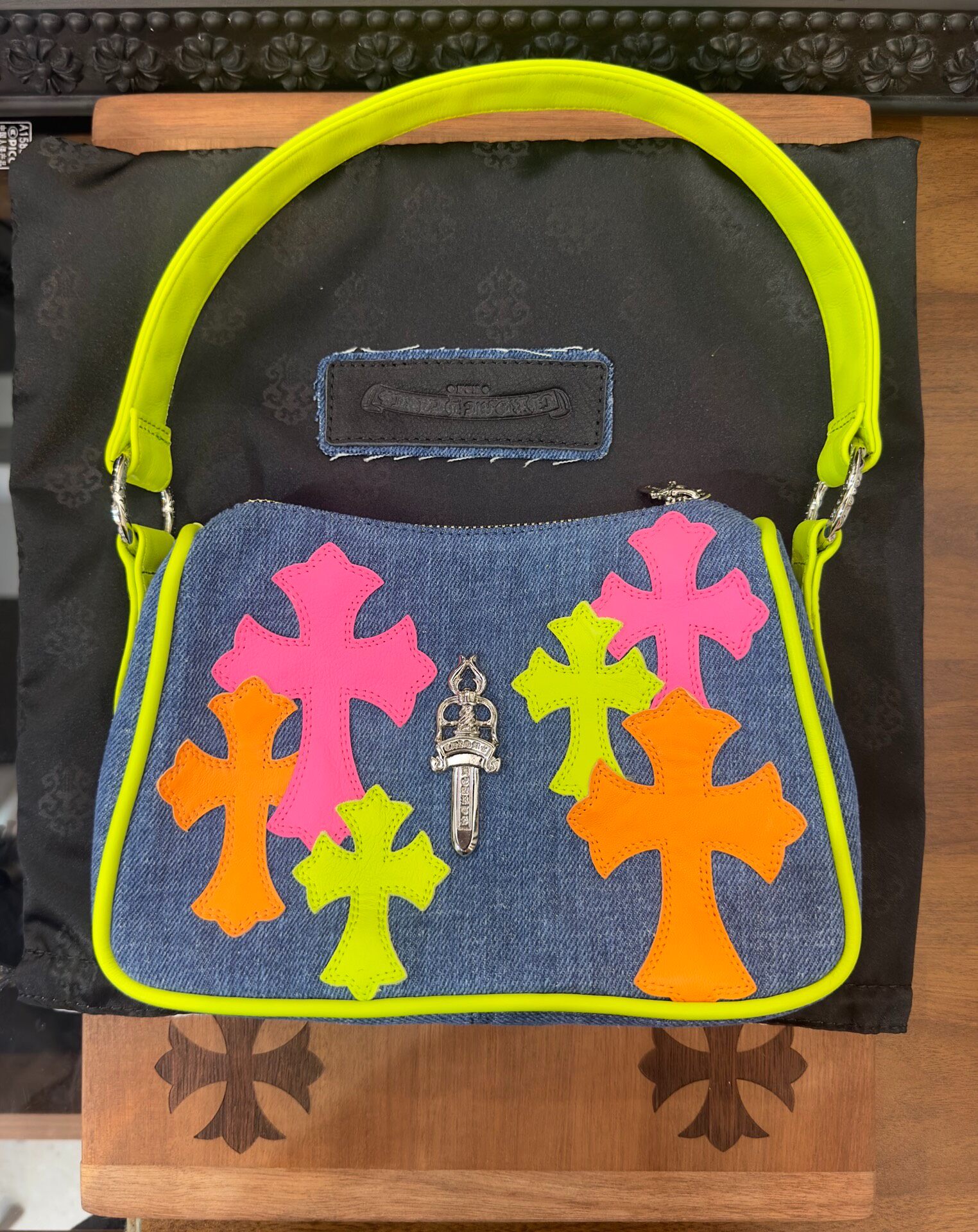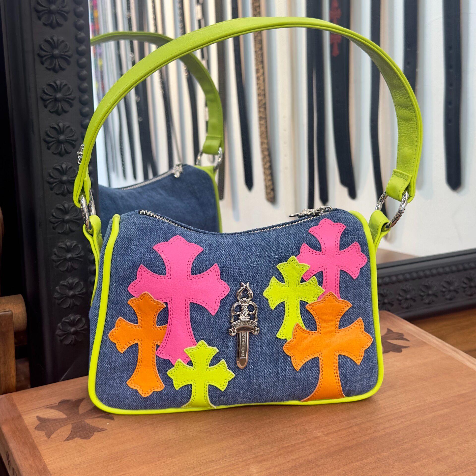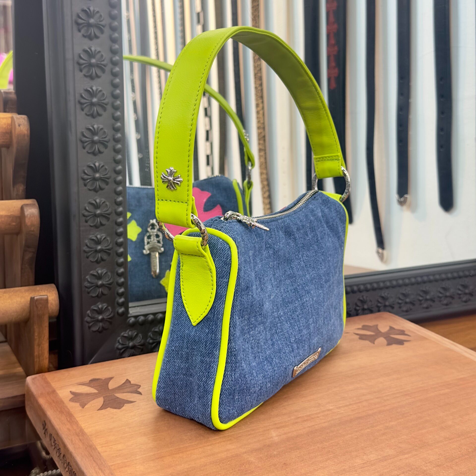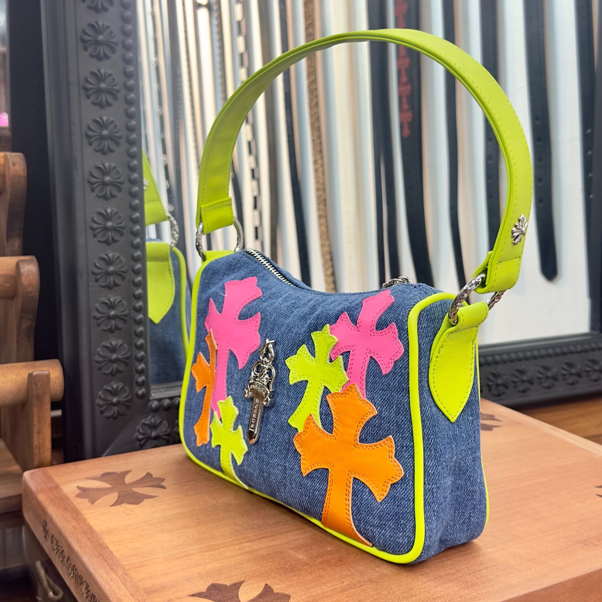 アートとファッションが交差する、世界的アートイベント「Art Basel Miami」にて披露された限定コレクション。鮮やかなネオンカラーのレザークロスパッチが、デニム素材に映えるプレイフルなデザインのナゲットバッグ。コンパクトながらも存在感のあるシルエットに、シルバーのクロムハーツ定番ダガーチャームを添えた贅沢な仕上がりです。普段使いからイベントシーンまで、幅広く活躍する一点。